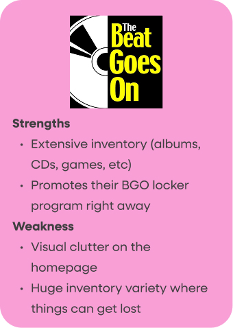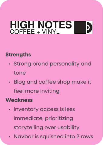 I analyzed four other independent record store websites to understand industry patterns in visual design, navigation structure, and inventory presentation. The goal was to identify opportunities for PCV to differentiate itself while meeting user expectations.