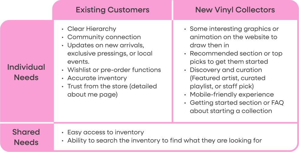 I outlined the stores two main target audiences along with their individual and shared needs within the redesign.