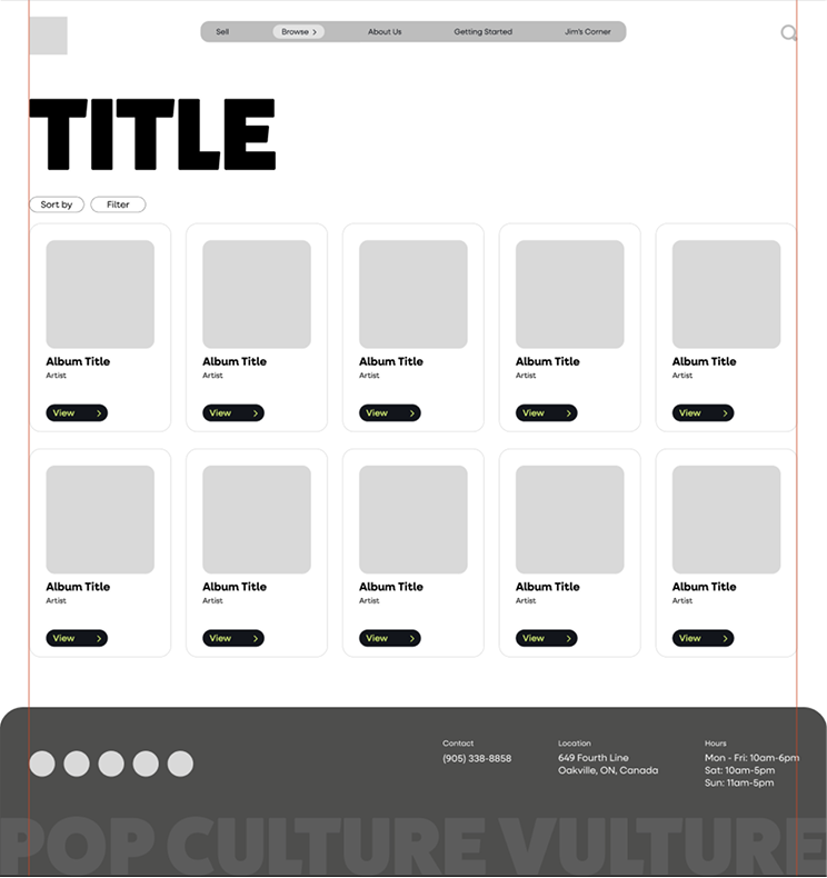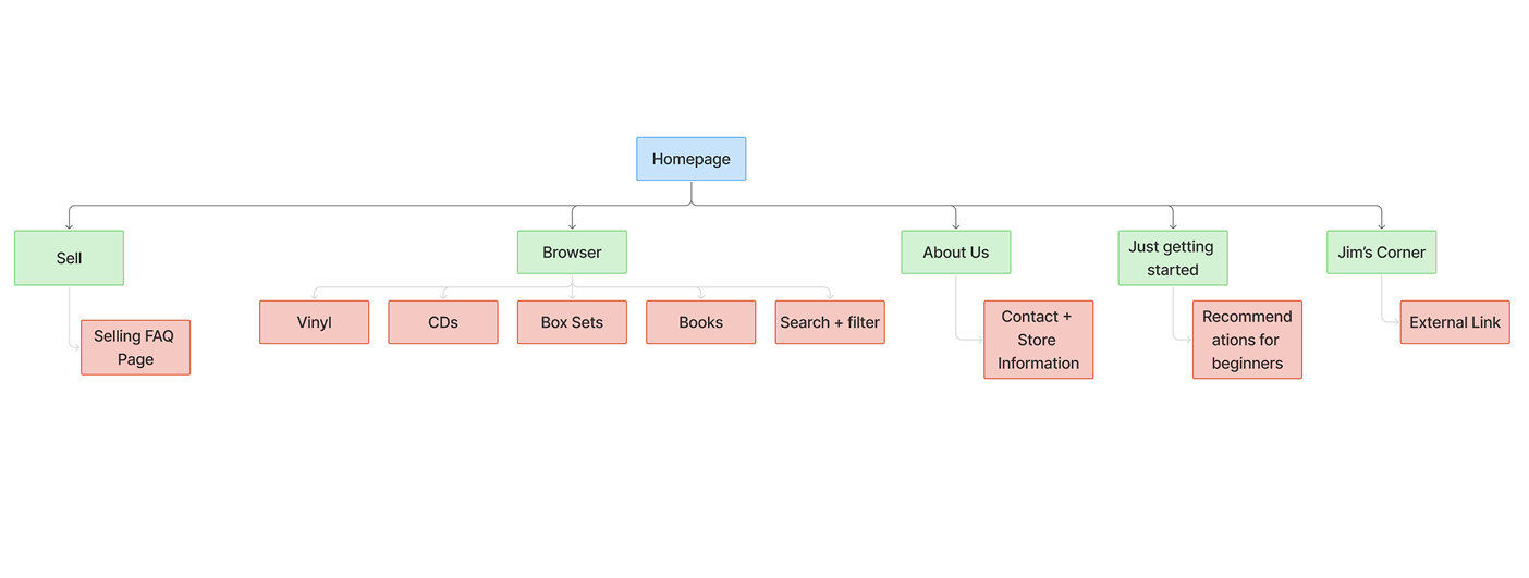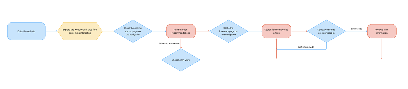 Jaine and I developed separate user flows for our new target audience, existing and new vinyl collectors, to reflect their different browsing behaviours. Existing customers prioritize efficiency and direct access to inventory, while newer customers rely more on discovery, curation, and guidance. Designing for both flows ensured the final experience balanced functionality with exploration.
