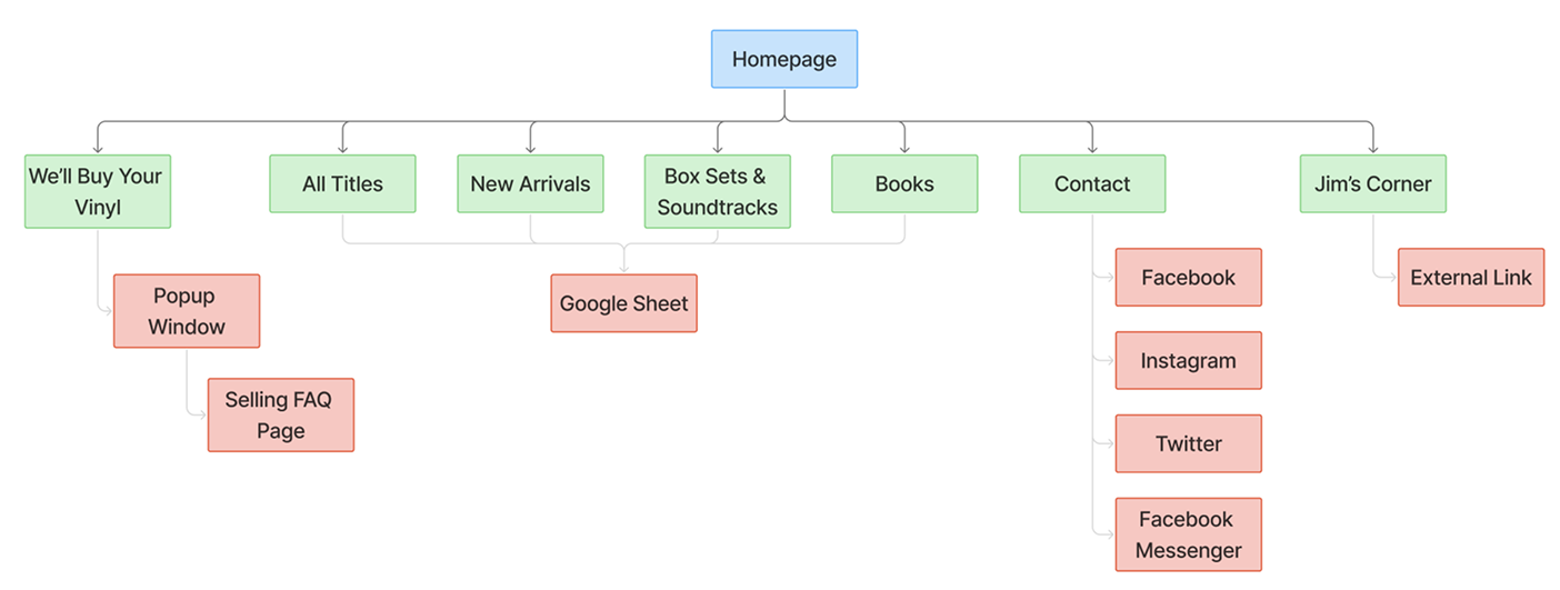 The original sitemap created a broken experience by opening a new page for nearly every interaction and directing users to an embedded Google Sheets document to view inventory. This disrupted the flow and made browsing inefficient.