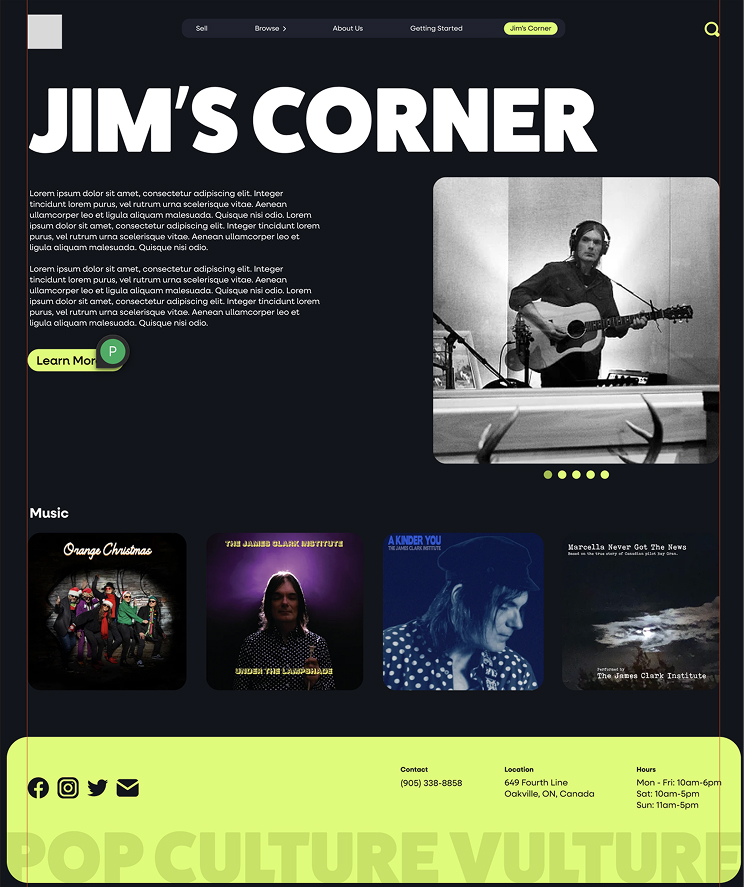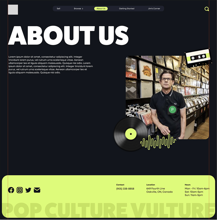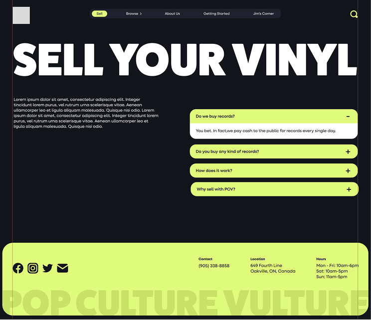 Our visual research revealed that many record stores rely on red colour schemes paired with black and white. To avoid blending into an already saturated market, we intentionally selected a vibrant neon lime green as PCV’s primary accent colour. This decision differentiates the brand while maintaining the bold, high-contrast aesthetic commonly associated with music culture. I also chose font pairings that are simple yet bold, prioritizing legibility while maintaining a strong visual presence.